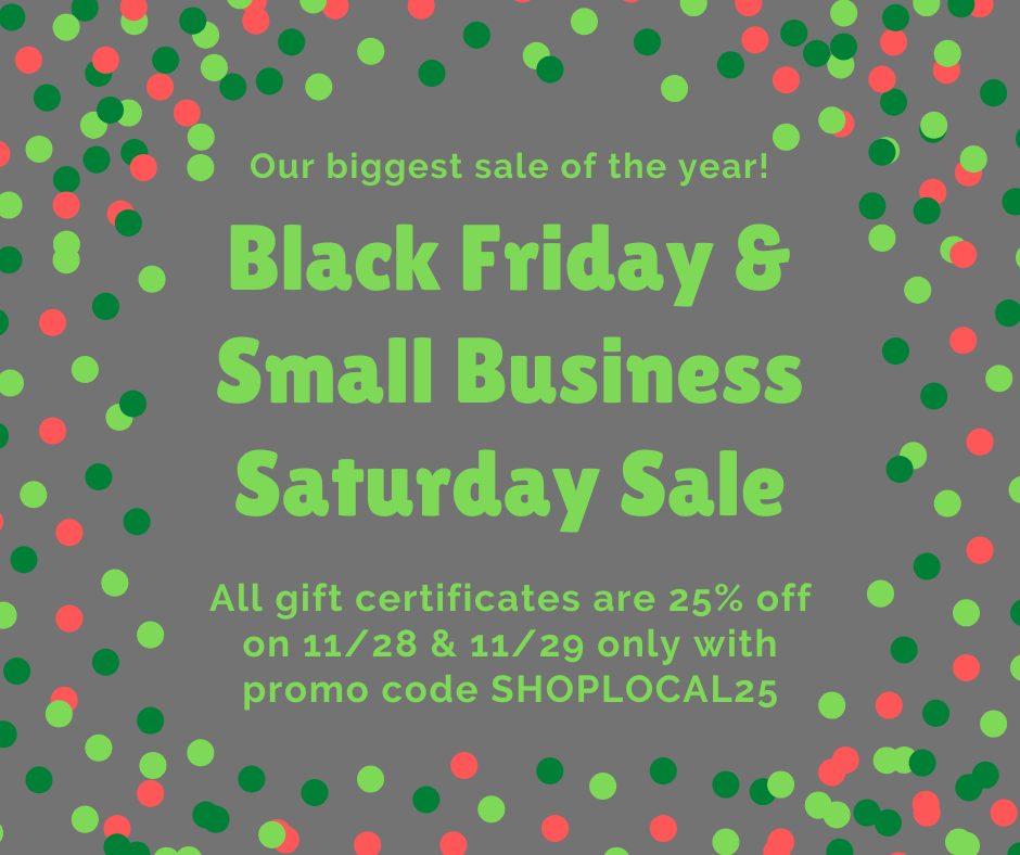 📣Sale Alert!📣 Our annual Black Friday & Small Business Saturday sale is happening next week! This 2 day sale will be our biggest discount of the year, so be sure to mark your calendars! Save 25% on all gift certificates on 11/28 & 11/29 ONLY by using the promo code SHOPLOCAL25