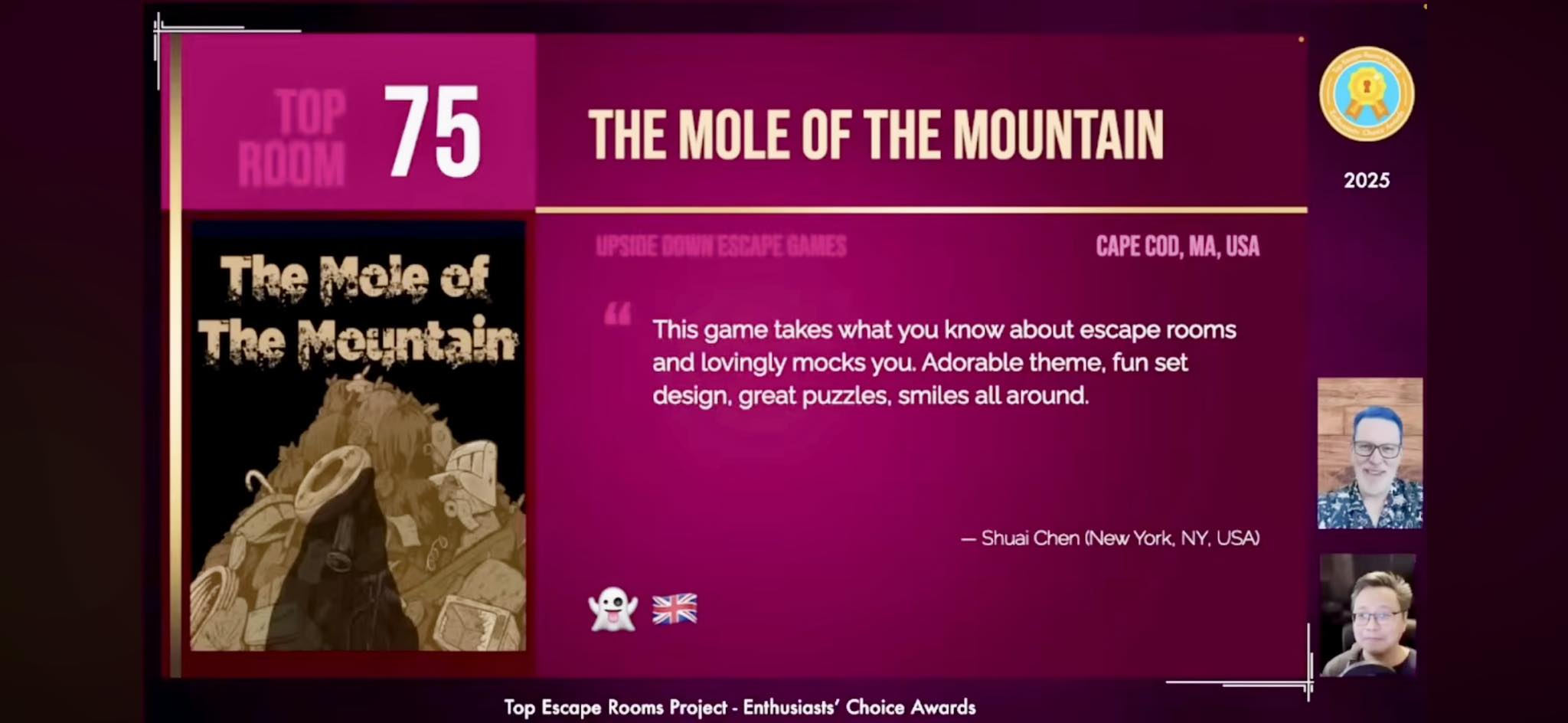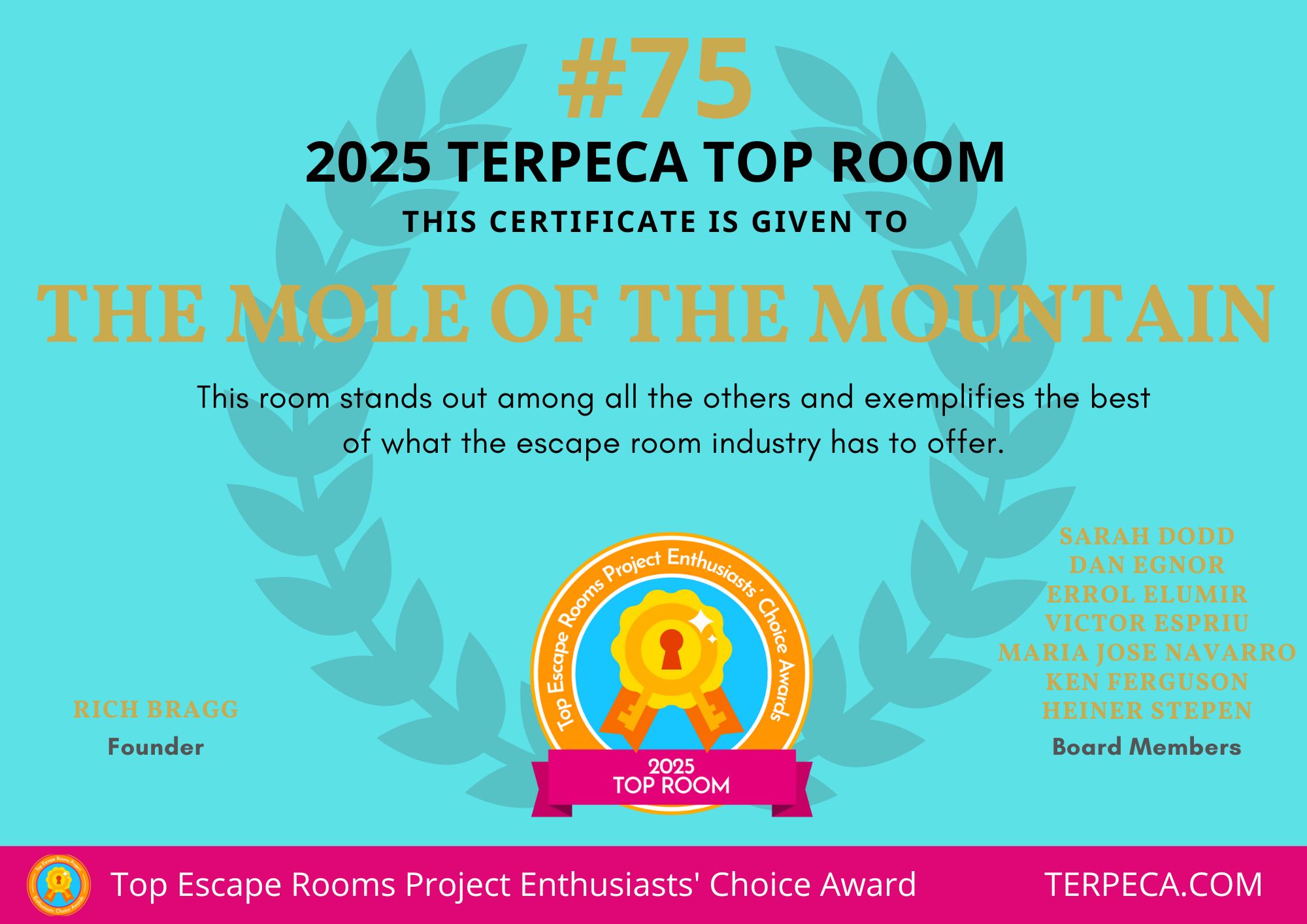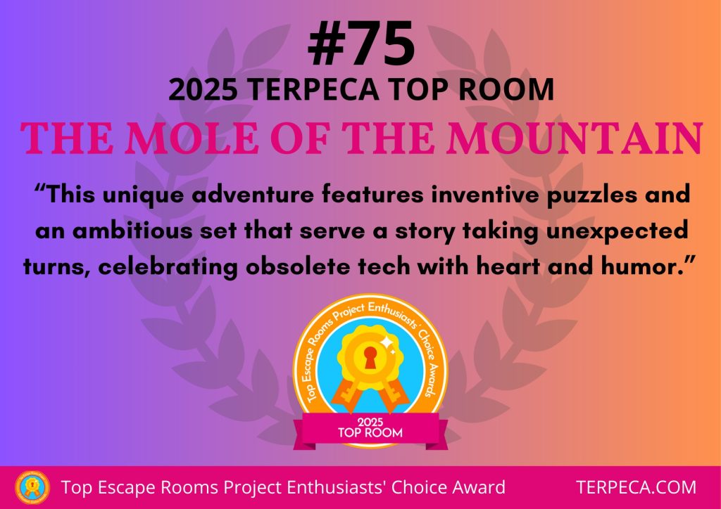 “We are thrilled to announce that your room, The Mole of the Mountain, has won a TERPECA for the #75 Top Room in the 2025 Top Escape Rooms Project Enthusiasts’ Choice Awards. Congratulations! This award is based on the opinions of hundreds of the most experienced escape room enthusiasts in the world, who collectively decided that you are among the best of the best in the global escape room industry. We believe that this is the highest award for escape rooms that one can receive today, and you should be extremely proud of this accomplishment.”